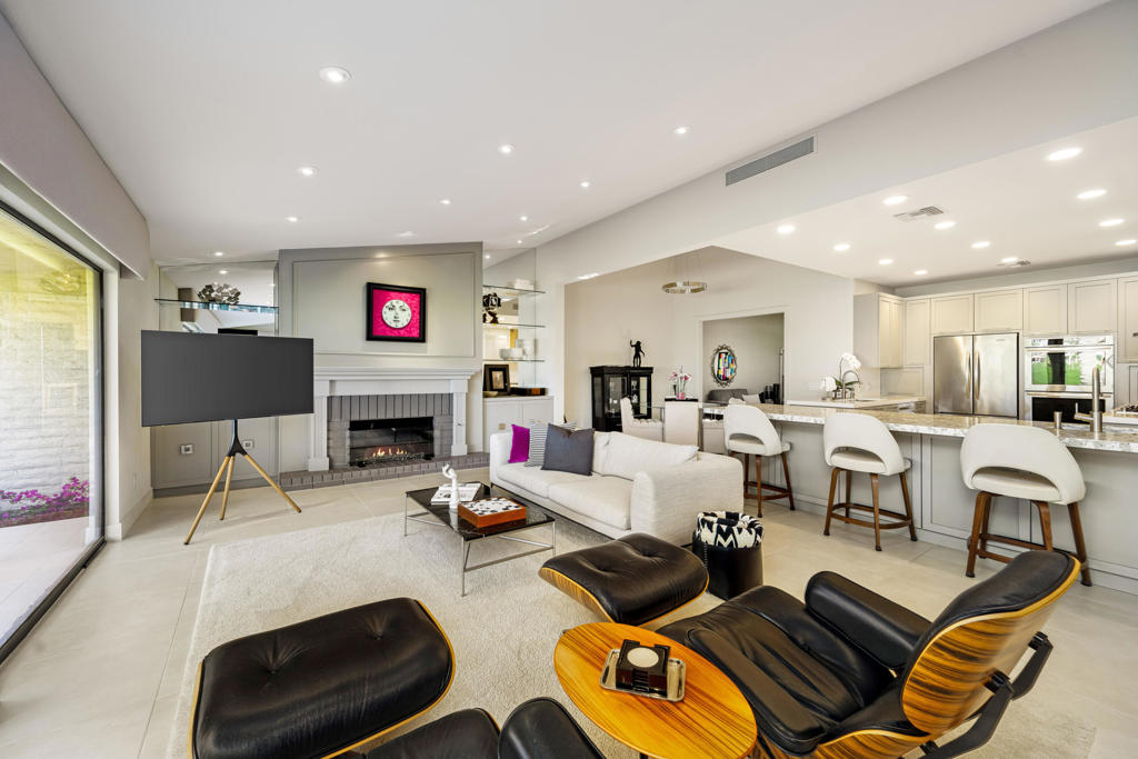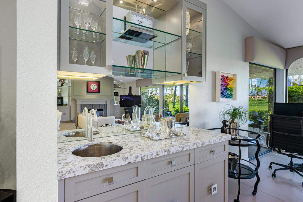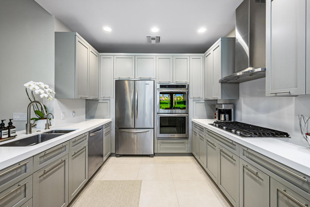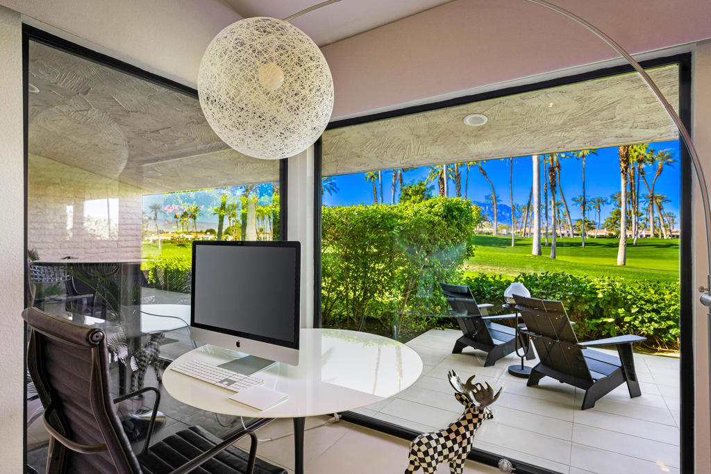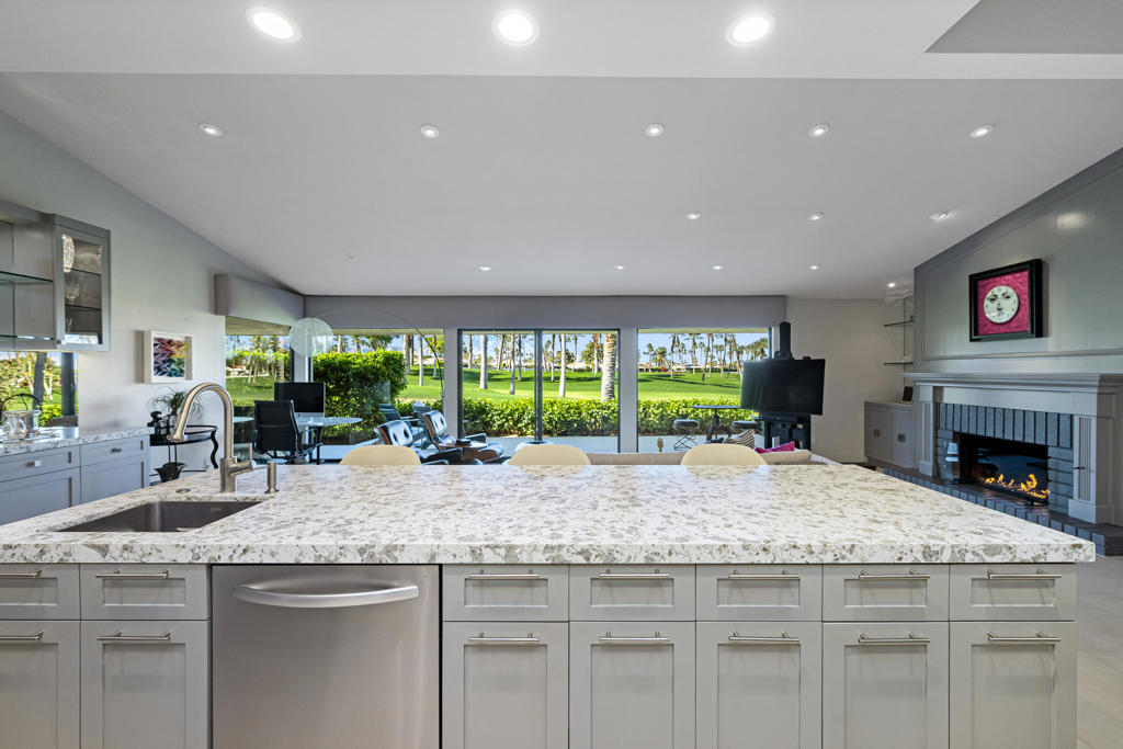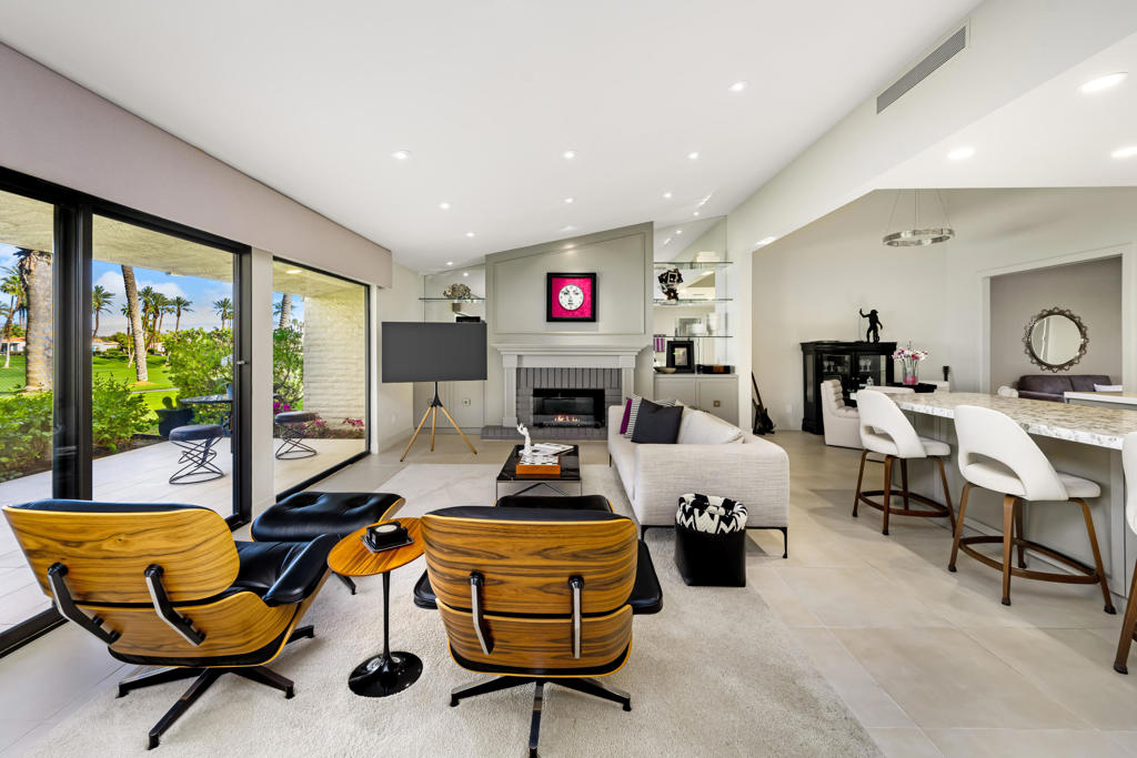Discover the very best of desert living in this spectacularly reimagined 3-bedroom, 3-bath residence, perfectly positioned within the prestigious Desert Horizons Country Club in Indian Wells. Set on a prime west-facing lot with a rare triple fairway view, the home captures sweeping mountain views & unforgettable sunsets that transform the sky each evening. It's a daily masterpiece you'll never take for granted. Beyond the views, this home offers something even more special -- a vibrant lifestyle. Desert Horizons is known for its welcoming neighbors, dynamic social scene, & exceptional amenities. The newly completed clubhouse, state-of-the-art fitness center, and beautiful restaurant create a true community hub where friendships flourish through a resort experience. Inside, the home has been thoughtfully redesigned to blend sophisticated style with effortless comfort. A newly installed structural beam opens the living & dining areas into one expansive, light-filled space -- ideal for both intimate evenings and lively gatherings. At the heart of the home is a chef's kitchen designed to impress, featuring double convection ovens, dual sinks, two dishwashers, generous prep space, & abundant custom storage. It's a kitchen built for entertaining as beautifully as it functions. The enclosed atrium enhances the flow and adds flexible living space filled with natural light, creating a peaceful retreat within the home. The primary suite is a private sanctuary, complete with a spa-inspired bath, four walk-in closets, & integrated laundry area for exceptional convenience. Every detail has been curated with intention -- from high-end finishes & impeccable craftsmanship to stainless steel hinges, plush new carpeting, & an epoxy-coated garage floor. Recent upgrades include two newer HVAC systems, motorized west-facing blinds, a new awning, custom landscaping with updated irrigation, a bespoke entry gate, and a beautifully tiled back patio that seamlessly blends indoor & outdoor living. The home is offered with most of its essential high-end designer furnishings & numerous practical pieces with others available for purchase, allowing you to step into a fully realized aesthetic - stylishly curated, cohesive custom home which is move-in ready. Whether you're hosting sunset dinners on the patio, enjoying quiet mornings with mountain views, or immersing yourself in the vibrant club lifestyle, this home delivers an unmatched combination of beauty, comfort.& community!